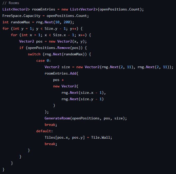 Looping over the entire map, a list of Vector2 is kept track of, marking the starting-positions of rooms randomly chosen. Then, paths are generated between the rooms, allowing units to traverse from one to the other.